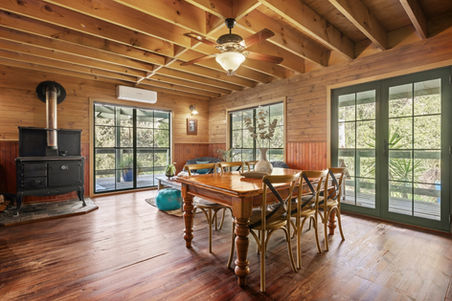 A winding horseshoe driveway leads you to the welcoming wraparound verandah, perfectly positioned to overlook the distant hills. Inside, dramatic ceilings, exposed beams, and rich timber floors frame the open-plan lounge and dining area, warmed by a wood fire and cooled by a ceiling fan. A dedicated bar corner adds a touch of fun for nights in with friends.